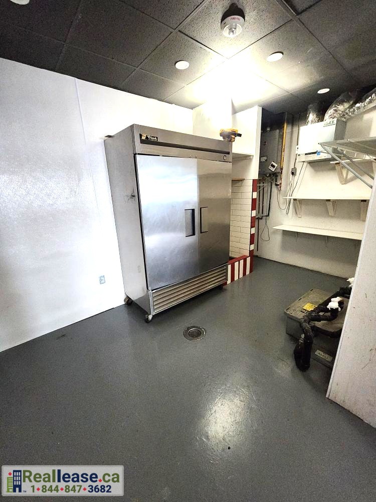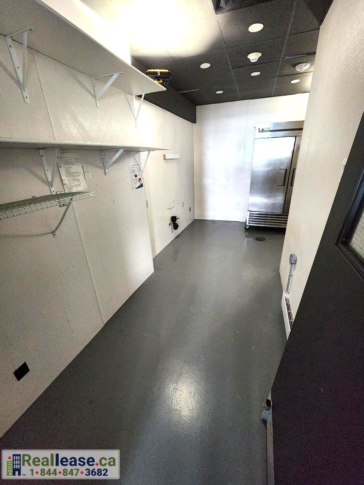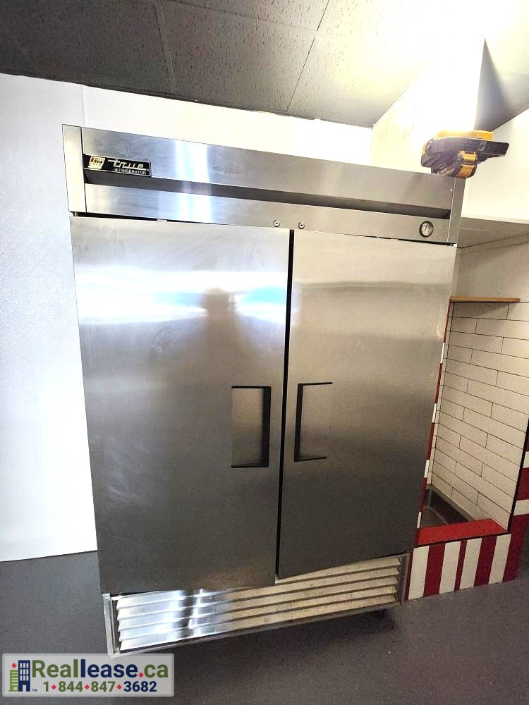 - Mid-size rear storage area with a large industrial refrigerator (True Double Solid Door 54″ Stainless Steel)
